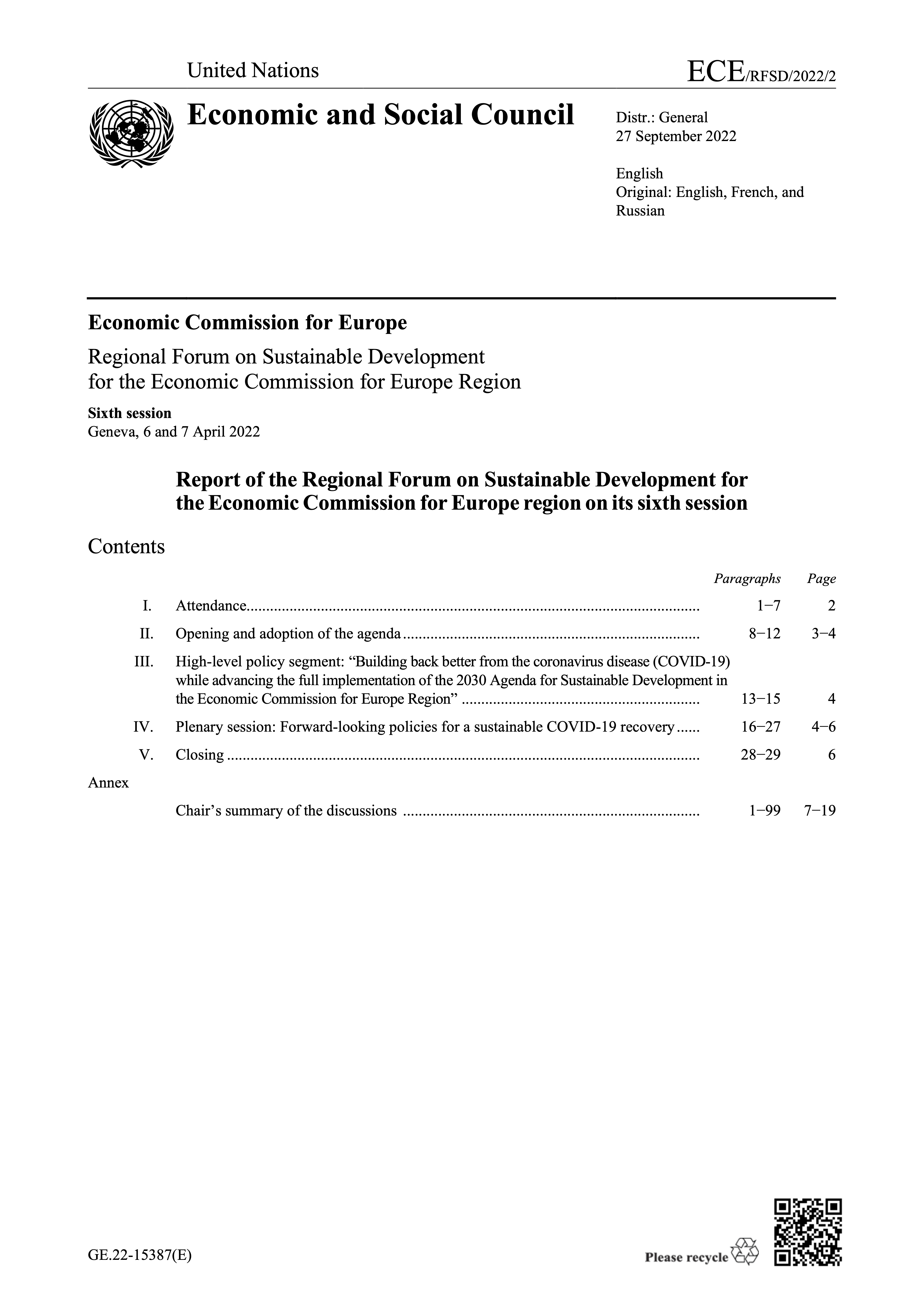 How to build back better from the COVID-19 crisis while advancing the full implementation of the 2030 Agenda for Sustainable Development in the UNECE region? The 2022 UNECE Regional Forum on Sustainable Development aimed to uncover concrete policy actions to accelerate SDG progress and support efforts to build a resilient and sustainable economic recovery.